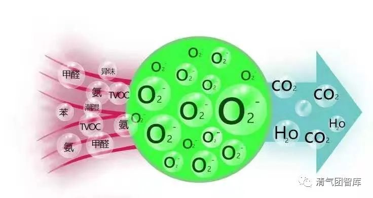 負離子與氣體分子(原子)發(fā)生非彈性碰撞,發(fā)生激發(fā)、離解、電離等一系列反應,使氣體處于活化狀態(tài)而產生的活性自由基以活化污染物分子,分子發(fā)生斷裂而被分解,最終可將惡臭氣體轉化為 CO2,H2O 等空氣中常態(tài)分子。
