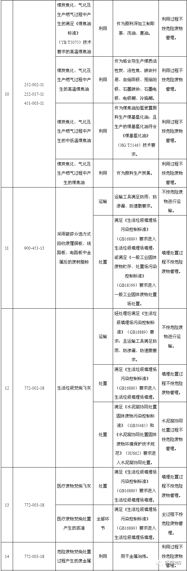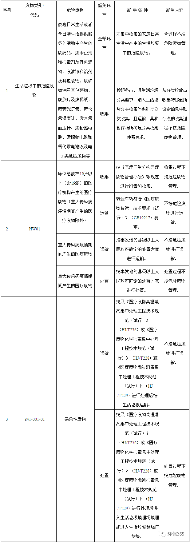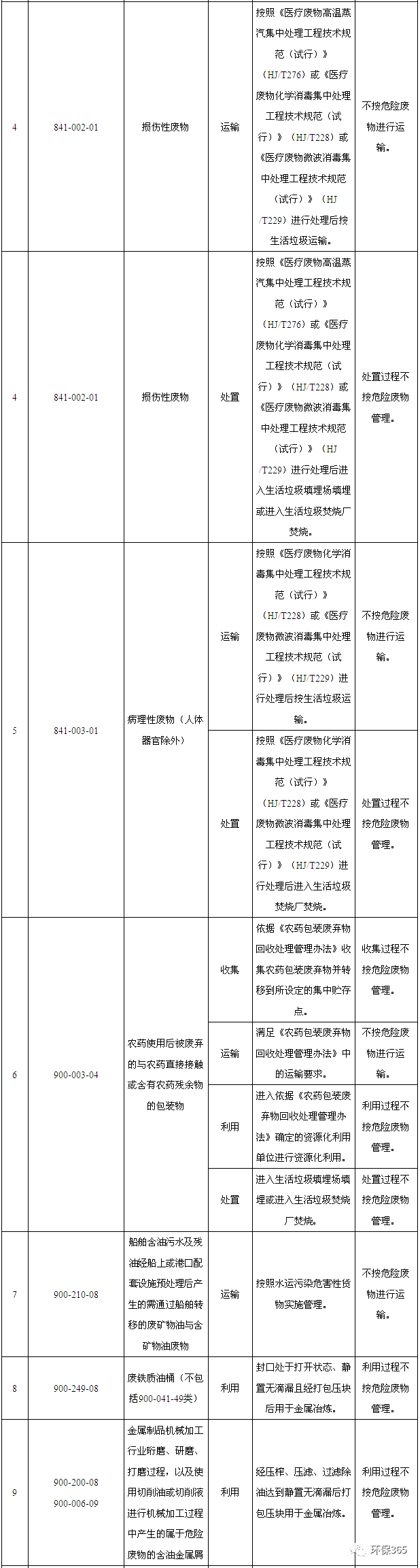 (1)家庭日常生活或者為日常生活提供服務(wù)的活動(dòng)中產(chǎn)生的廢藥品、廢殺蟲劑和消毒劑及其包裝物、廢油漆和溶劑及其包裝物、廢礦物油及其包裝物、廢膠片及廢像紙、廢熒光燈管、廢含汞溫度計(jì)、廢含汞血壓計(jì)、廢鉛蓄電池、廢鎳鎘電池和氧化汞電池以及電子類危險(xiǎn)廢物等未經(jīng)過集中收集的全部環(huán)節(jié)不按危險(xiǎn)廢物管理;按照各市、縣生活垃圾分類要求,納入生活垃圾分類收集體系進(jìn)行分類收集,且運(yùn)輸工具和暫存場(chǎng)所滿足分類收集體系要求的,從分類投放點(diǎn)收集轉(zhuǎn)移到所設(shè)定的集中貯存點(diǎn)的收集過程不按危險(xiǎn)廢物管理。(2)床位總數(shù)在19張以下(含19張)的醫(yī)療機(jī)構(gòu)產(chǎn)生的醫(yī)療廢物(重大傳染病疫情期間產(chǎn)生的醫(yī)療廢物除外)按《醫(yī)療衛(wèi)生機(jī)構(gòu)醫(yī)療廢物管理辦法》等規(guī)定進(jìn)行消毒和收集的,收集過程不按危險(xiǎn)廢物管理;轉(zhuǎn)運(yùn)車輛符合《醫(yī)療廢物轉(zhuǎn)運(yùn)車技術(shù)要求(試行)》(GB19217)要求的,不按危險(xiǎn)廢物進(jìn)行運(yùn)輸;重大傳染病疫情期間產(chǎn)生的醫(yī)療廢物,按事發(fā)地的縣級(jí)以上人民政府確定的處置方案進(jìn)行運(yùn)輸?shù)?,不按危險(xiǎn)廢物進(jìn)行運(yùn)輸;按事發(fā)地的縣級(jí)以上人民政府確定的處置方案進(jìn)行處置的,處置過程不按危險(xiǎn)廢物管理。(3)感染性廢物按照《醫(yī)療廢物高溫蒸汽集中處理工程技術(shù)規(guī)范(試行)》(HJ/T276)或《醫(yī)療廢物化學(xué)消毒集中處理工程技術(shù)規(guī)范(試行)》(HJ/T228)或《醫(yī)療廢物微波消毒集中處理工程技術(shù)規(guī)范(試行)》(HJ/T229)進(jìn)行處理后按生活垃圾運(yùn)輸?shù)?,不按危險(xiǎn)廢物進(jìn)行運(yùn)輸;按照《醫(yī)療廢物高溫蒸汽集中處理工程技術(shù)規(guī)范(試行)》(HJ/T276)或《醫(yī)療廢物化學(xué)消毒集中處理工程技術(shù)規(guī)范(試行)》(HJ/T228)或《醫(yī)療廢物微波消毒集中處理工程技術(shù)規(guī)范(試行)》(HJ/T229)進(jìn)行處理后進(jìn)入生活垃圾填埋場(chǎng)填埋或進(jìn)入生活垃圾焚燒廠焚燒的,處置過程不按危險(xiǎn)廢物管理。(4)損傷性廢物按照《醫(yī)療廢物高溫蒸汽集中處理工程技術(shù)規(guī)范(試行)》(HJ/T276)或《醫(yī)療廢物化學(xué)消毒集中處理工程技術(shù)規(guī)范(試行)》(HJ/T228)或《醫(yī)療廢物微波消毒集中處理工程技術(shù)規(guī)范(試行)》(HJ/T229)進(jìn)行處理后按生活垃圾運(yùn)輸?shù)?,不按危險(xiǎn)廢物進(jìn)行運(yùn)輸;按照《醫(yī)療廢物高溫蒸汽集中處理工程技術(shù)規(guī)范(試行)》(HJ/T276)或《醫(yī)療廢物化學(xué)消毒集中處理工程技術(shù)規(guī)范(試行)》(HJ/T228)或《醫(yī)療廢物微波消毒集中處理工程技術(shù)規(guī)范(試行)》(HJ/T229)進(jìn)行處理后進(jìn)入生活垃圾填埋場(chǎng)填埋或進(jìn)入生活垃圾焚燒廠焚燒的,處置過程不按危險(xiǎn)廢物管理。(5)病理性廢物(人體器官除外)按照《醫(yī)療廢物化學(xué)消毒集中處理工程技術(shù)規(guī)范(試行)》(HJ/T228)或《醫(yī)療廢物微波消毒集中處理工程技術(shù)規(guī)范(試行)》(HJ/T229)進(jìn)行處理后按生活垃圾運(yùn)輸?shù)?,不按危險(xiǎn)廢物進(jìn)行運(yùn)輸;按照《醫(yī)療廢物化學(xué)消毒集中處理工程技術(shù)規(guī)范(試行)》(HJ/T228)或《醫(yī)療廢物微波消毒集中處理工程技術(shù)規(guī)范(試行)》(HJ/T229)進(jìn)行處理后進(jìn)入生活垃圾焚燒廠焚燒的,處置過程不按危險(xiǎn)廢物管理。(6)農(nóng)藥使用后被廢棄的與農(nóng)藥直接接觸或含有農(nóng)藥殘余物的包裝物依據(jù)《農(nóng)藥包裝廢棄物回收處理管理辦法》收集并轉(zhuǎn)移到所設(shè)定的集中貯存點(diǎn)的,收集過程不按危險(xiǎn)廢物管理;滿足《農(nóng)藥包裝廢棄物回收處理管理辦法》中的運(yùn)輸要求的,不按危險(xiǎn)廢物進(jìn)行運(yùn)輸;進(jìn)入依據(jù)《農(nóng)藥包裝廢棄物回收處理管理辦法》確定的資源化利用單位進(jìn)行資源化利用的,利用過程不按危險(xiǎn)廢物管理;進(jìn)入生活垃圾填埋場(chǎng)填埋或進(jìn)入生活垃圾焚燒廠焚燒的,處置過程不按危險(xiǎn)廢物管理。(7)船舶含油污水及殘油經(jīng)船上或港口配套設(shè)施預(yù)處理后產(chǎn)生的需通過船舶轉(zhuǎn)移的廢礦物油與含礦物油廢物按照水運(yùn)污染危害性貨物實(shí)施管理的,不按危險(xiǎn)廢物進(jìn)行運(yùn)輸。(8)廢鐵質(zhì)油桶(不包括900-041-49類)封口處于打開狀態(tài)、靜置無滴漏且經(jīng)打包壓塊后用于金屬冶煉的,利用過程不按危險(xiǎn)廢物管理。(9)金屬制品機(jī)械加工行業(yè)珩磨、研磨、打磨過程,以及使用切削油或切削液進(jìn)行機(jī)械加工過程中產(chǎn)生的屬于危險(xiǎn)廢物的含油金屬屑經(jīng)壓榨、壓濾、過濾除油達(dá)到靜置無滴漏后打包壓塊用于金屬冶煉的,利用過程不按危險(xiǎn)廢物管理。(10)煤炭焦化、氣化及生產(chǎn)燃?xì)膺^程中產(chǎn)生的滿足《煤焦油標(biāo)準(zhǔn)》(YB/T5075)技術(shù)要求的高溫煤焦油作為原料深加工制取萘、洗油、蒽油的,利用過程不按危險(xiǎn)廢物管理。煤炭焦化、氣化及生產(chǎn)燃?xì)膺^程