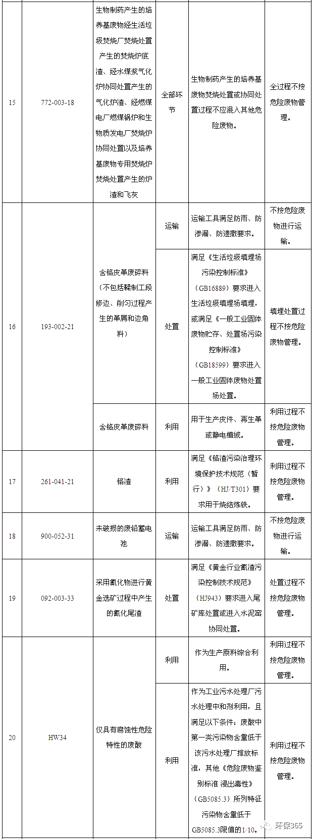 如:生活垃圾焚燒飛灰滿足《生活垃圾填埋場(chǎng)污染控制標(biāo)準(zhǔn)》(GB16889-2008)中6.3條要求且進(jìn)入生活垃圾填埋場(chǎng)填埋,填埋過程可不按危險(xiǎn)廢物管理;如果不能滿足《生活垃圾填埋場(chǎng)污染控制標(biāo)準(zhǔn)》(GB16889-2008)中6.3條要求或不進(jìn)入生活垃圾填埋場(chǎng),則處置過程仍然需要按照危險(xiǎn)廢物管理。