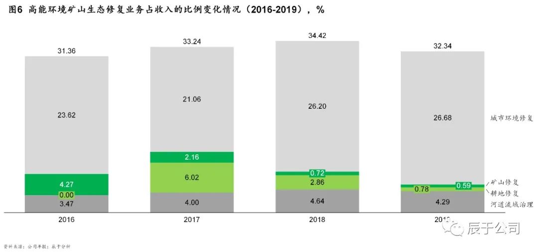 由于市場潛力并未有效釋放,領(lǐng)先的土壤修復(fù)企業(yè)參與這一市場較為謹慎,包括高能環(huán)境、中科鼎實、建工修復(fù)等龍頭在礦山生態(tài)修復(fù)領(lǐng)域的參與項目很少。以高能環(huán)境為例,近年來礦山生態(tài)修復(fù)占總收入的比重不升反降,2016年這一數(shù)字為4.27%,2019年則僅為0.59%(見圖6)。