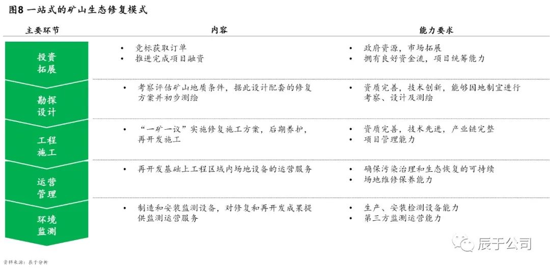 參考國際成熟經(jīng)驗,我們認為未來EPC仍然是主流模式。不過隨著推進大礦山生態(tài)修復(fù)勢在必行,預(yù)計PPP項目數(shù)量將有所增加,尤其是遼寧、河南、山東、內(nèi)蒙古等礦山生態(tài)修復(fù)走在前列的省份值得關(guān)注。當(dāng)然,這對入局企業(yè)也提出了更高要求,他們不僅要有較強的政府資源和市場拓展能力,還要關(guān)注礦山生態(tài)修復(fù)多環(huán)節(jié)的打通,提升諸如生態(tài)環(huán)境考察評估、破壞診斷、方案設(shè)計、修復(fù)系統(tǒng)構(gòu)造、生態(tài)景觀建設(shè)、系統(tǒng)跟蹤與維護、環(huán)境監(jiān)測等各項能力,打造一站式整體修復(fù)模式(見圖7)。
