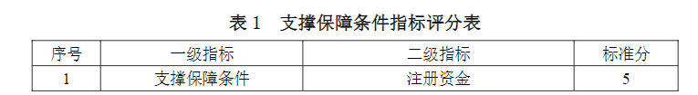 支撐保障條件指標(biāo)包括環(huán)境咨詢(環(huán)保管家)服務(wù)單位的注冊(cè)資金、上年度營業(yè)收入、員工數(shù)量、職稱、質(zhì)量管理體系以及業(yè)務(wù)培訓(xùn)6項(xiàng)二級(jí)指標(biāo)。支撐保障條件指標(biāo)評(píng)分見表1。