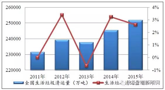 “十二五”期間中國生活垃圾清運(yùn)量及增長率