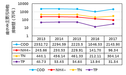 根據(jù)2013-2017年《中國統(tǒng)計年鑒》,我國廢水排放總量保持在700億噸,其中廢水中COD、氨氮(NH4+)、總氮(TN)、TP排放量如下圖,可見2015年國務(wù)院發(fā)布了《水污染防治行動計劃》(簡稱“水十條”)后,這幾種污染物排放量得到了削減。