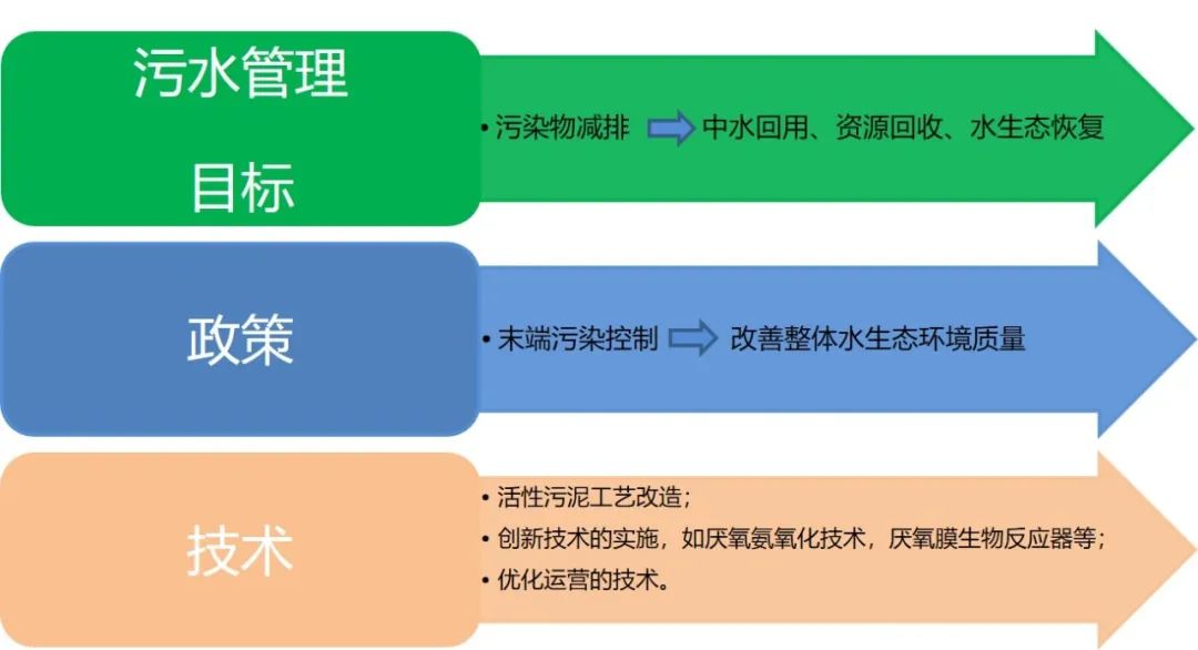近幾十年來,中國污水行業(yè)經(jīng)歷了高速增長,在基礎(chǔ)設(shè)施建設(shè)、技術(shù)創(chuàng)新、人才培養(yǎng)等方面取得了進步,為未來的智慧化、低碳化、資源化發(fā)展奠定了堅實的基礎(chǔ)。然而,未來仍然充滿不確定性和挑戰(zhàn)。預(yù)計隨著人口的持續(xù)增長和城市化進程,水資源短缺將更加嚴重,而污水量將進一步增加。這將要求污水管理目標、政策和技術(shù)發(fā)生根本性變化,如下圖: