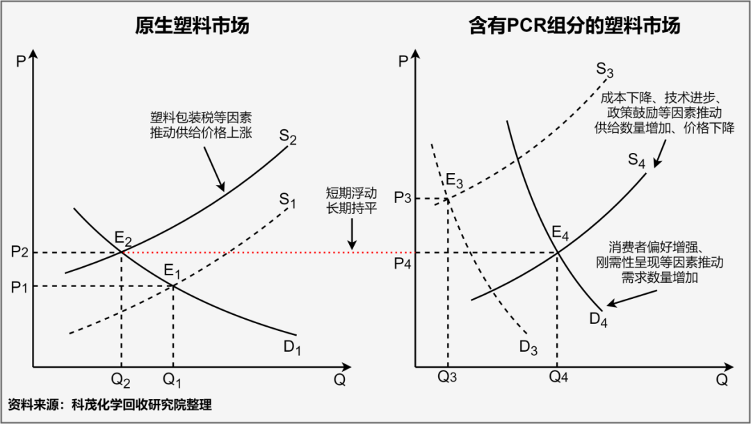 過去由于化學(xué)回收技術(shù)水平低、生產(chǎn)成本高、政策支持少、市場預(yù)期低等因素,導(dǎo)致PCR塑料供應(yīng)數(shù)量少、價格高;同時由于剛性需求尚未呈現(xiàn)、消費者偏好不足、替代品(純原生塑料)價格低等因素,導(dǎo)致PCR塑料需求數(shù)量少,因此含化學(xué)回收PCR組分塑料市場的理論均衡點E3在現(xiàn)實中幾乎不存在。近年來供需要素變化,使含PCR組分塑料的理論均衡價格從過去不可接受的程度,下降至現(xiàn)在雖然較高但可以接受的水平。