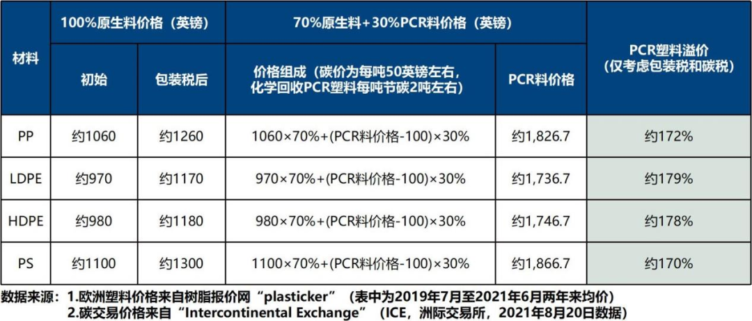 1.塑料包裝稅:以英國PP產(chǎn)品為例,近兩年來原生PP產(chǎn)品均價為每噸1,060英鎊左右,塑料包裝稅對少于30%再生塑料的包裝征收每噸200英鎊稅款,即每噸原生PP產(chǎn)品使用成本上升到1,260英鎊左右。