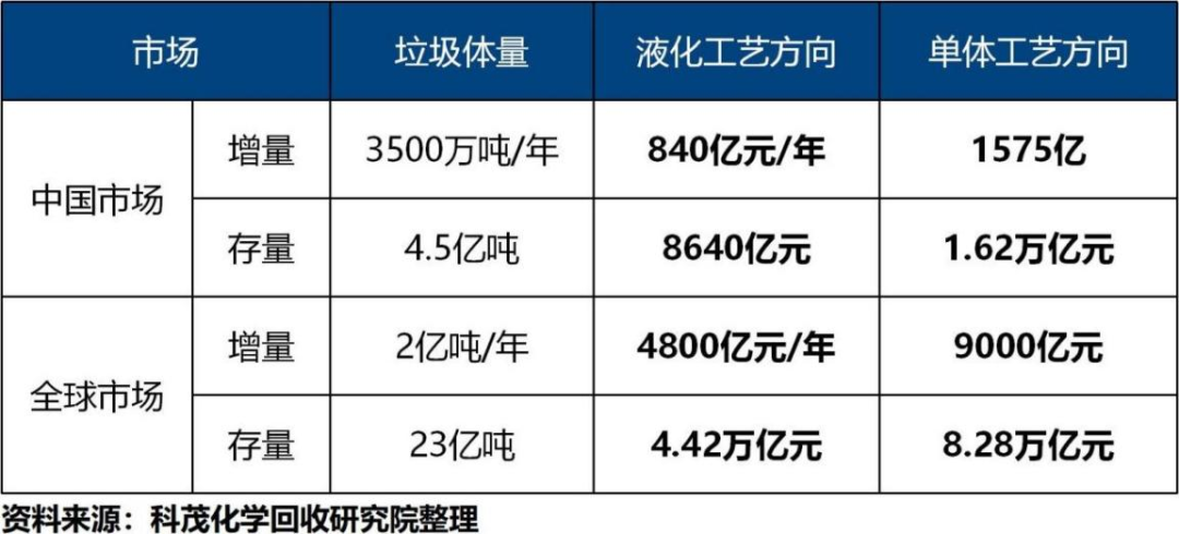 3.廢塑料化學(xué)回收的市場空間巨大,每年新增市場潛力在千億級別,存量市場在萬億級別。