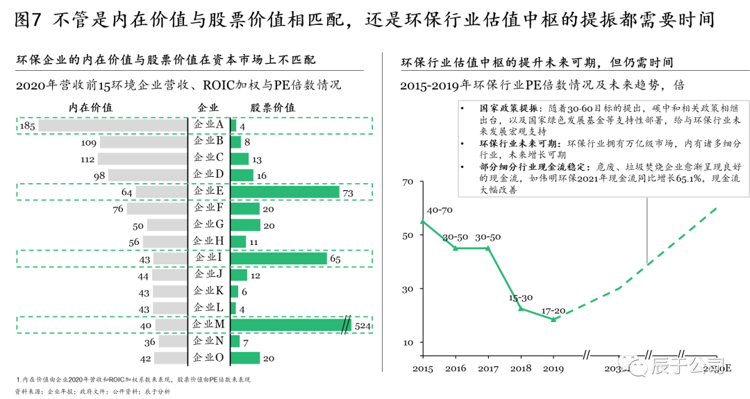 但必須承認(rèn)的是,向好趨勢(shì)的背后,我國(guó)資本市場(chǎng)的制度完善仍需時(shí)間。首先是生態(tài)環(huán)保企業(yè)內(nèi)在價(jià)值與股票價(jià)值的相匹配需要時(shí)間,在對(duì)生態(tài)環(huán)保企業(yè)2020年?duì)I收前15強(qiáng)的營(yíng)收、ROIC加權(quán)和PE倍數(shù)進(jìn)行分析得到,多數(shù)企業(yè)(如企業(yè)A、E、I、M)的內(nèi)在價(jià)值與股票價(jià)值在資本市場(chǎng)上并不匹配。其次是生態(tài)環(huán)保估值中樞的提升仍需時(shí)日,盡管隨著國(guó)家政策的提振、生態(tài)環(huán)保行業(yè)的發(fā)展、部分細(xì)分行業(yè)企業(yè)現(xiàn)金流狀況的改善,環(huán)保估值中樞提升未來可期,但也并不是一蹴而就的(見圖7)。