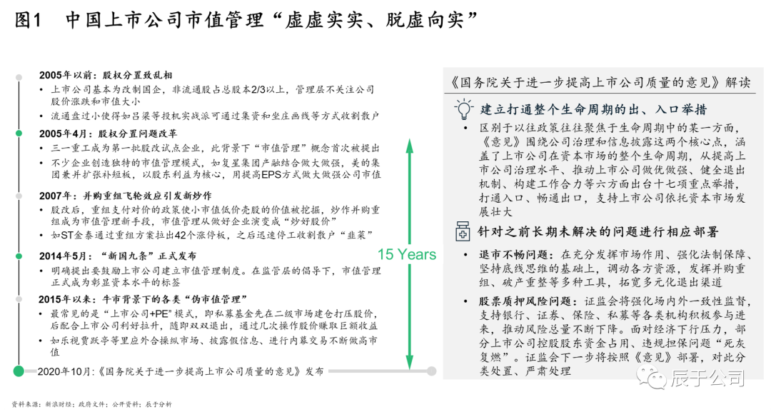 我國(guó)于2005年首次提出“市值管理”概念,但以此為名,資本市場(chǎng)長(zhǎng)期出現(xiàn)各類“偽市值管理”亂象,包括背后交易拉抬股價(jià)、鼓噪并購(gòu)重組吸引“韭菜”入場(chǎng)等,迫使政策不斷調(diào)整以規(guī)范市場(chǎng),直到2020年10月,國(guó)務(wù)院發(fā)布《關(guān)于進(jìn)一步提高上市公司質(zhì)量的意見》(以下簡(jiǎn)稱《意見》),政策上打通了上市公司在資本市場(chǎng)的整個(gè)生命周期、部署了之前長(zhǎng)期未解決問題的應(yīng)對(duì)措施,因而也對(duì)上市公司提出了更高要求,市值管理開始“脫虛向?qū)崱保ㄒ妶D1)。
