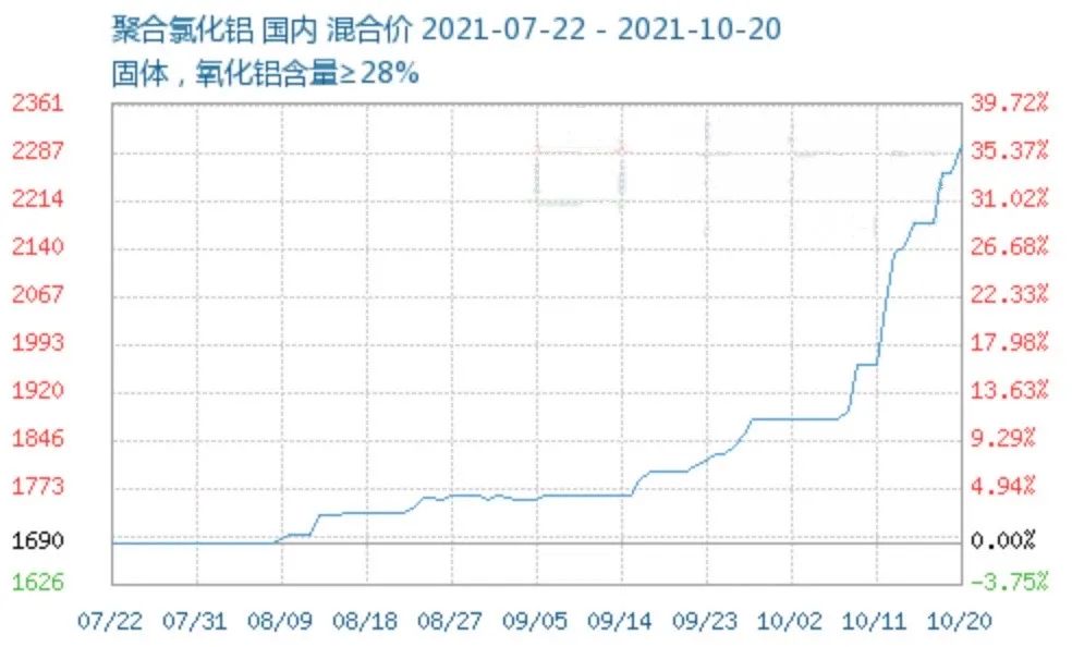一起上漲的還有同樣的替代品,例如聚合氯化鋁在10月上半月上漲17%左右,主要原因是上游原材料鹽酸企業(yè)檢修增多,供應(yīng)減少,下游采購積極性加強,市場供不應(yīng)求,導(dǎo)致鹽酸價格偏緊。