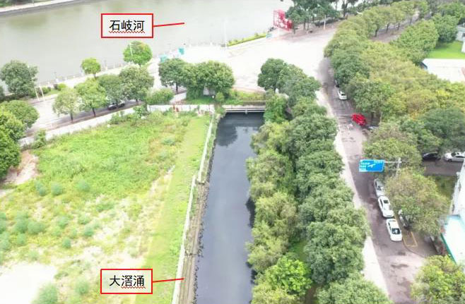 ▼2021年7月30日,督察組使用無人機(jī)拍攝,大滘涌水體發(fā)黑,與石岐河形成明顯對(duì)比