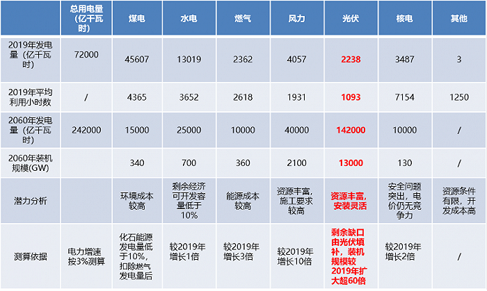 按最保守估算,電力消費年均增速3%,預(yù)計到2060年,中國電力年消費量將超過24萬億千瓦時。根據(jù)現(xiàn)在可以預(yù)測的能源相關(guān)技術(shù),我們對發(fā)電側(cè)各能源逐項進行分析,大致如下。