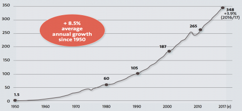 但是請(qǐng)環(huán)顧一下四周,有沒有發(fā)現(xiàn)你其實(shí)是被塑料包圍著。無論你在哪,塑料,這個(gè)人類創(chuàng)造的材料它一定在你身邊。自從上世紀(jì)五六十年代塑料被規(guī)?;a(chǎn)以來,它已經(jīng)取代了大部分其它材料,被用到了人類生活生產(chǎn)的各方各面。全球2018年生產(chǎn)的塑料總量按體積計(jì)算的話已經(jīng)超過了鋼的產(chǎn)量,達(dá)3.6億噸(塑料平均密度約1.1;鋼18.3億噸,密度7.8)。全球累計(jì)生產(chǎn)的塑料到2019年達(dá)到90億噸,相當(dāng)于1000座北京景山的重量。