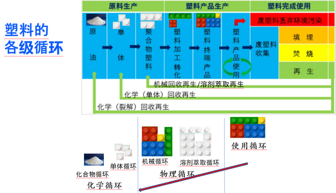 圖二:塑料的化學(xué)回收再生(化學(xué)循環(huán))和其他各級(jí)塑料循環(huán)的關(guān)系