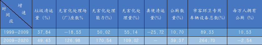 從上述統(tǒng)計看。截至1989年,全國只有37座生活垃圾無害化處理場(廠),雖然較1979年的12座翻了幾番,但與1999年數(shù)據(jù)相比,堪稱一窮二白,為避免數(shù)值失真,筆者在計算各指標增速時僅從1999年開始,大致以每十年為一個跨度來計算,統(tǒng)計結(jié)果如表2所示。表2 1999-2020年全國市容環(huán)衛(wèi)行業(yè)各指標增速