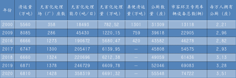 從表2可見,市容環(huán)衛(wèi)行業(yè)在2009年以后的發(fā)展可謂突飛猛進,從2009-2020年,全國垃圾清運量增加49.43%,相比1999-2009年間,增速提升了11.6個百分點;同一時期,無害化處理場數(shù)量增長126.98%,而前一個10年則是-18.53%;其他指標,垃圾無害化處理能力、垃圾無害化處理量、市容環(huán)衛(wèi)專用車輛設(shè)備總數(shù)均以倍速提升;公廁數(shù)量則增加了39.37%,而前一10年增速僅為10.70%。每萬人擁有的公廁數(shù)量是唯一一個下降的指標,考慮最近10年中國城市化的高速度,似乎也可以理解。最遺憾的還是糞便清運量,從2017年開始就無統(tǒng)計數(shù)據(jù),而歷史數(shù)據(jù)也是上下起伏不定。糞便處置不僅與廁所革命密切相關(guān),更關(guān)系到自然水體保護和食品安全,期待糞便處置能夠得到更多重視。《年鑒》顯示,2020年,全國縣城生活垃圾清運量達6810萬噸(約0.68億噸),總計擁有1428座無害化處理場(廠),生活垃圾處理能力358,319噸/日(約35.83萬噸/日),年無害化處理生活垃圾6691.32萬噸(約0.67億噸)。縣城總計擁有公廁55,548座(5.55萬座),平均每萬人擁有公廁3.51座,全國縣城共擁有環(huán)衛(wèi)專用車輛設(shè)備74,722輛(約7.47萬輛)。表3 2000-2020年全國縣城市容環(huán)衛(wèi)總體情況(大致按年代跨度)
