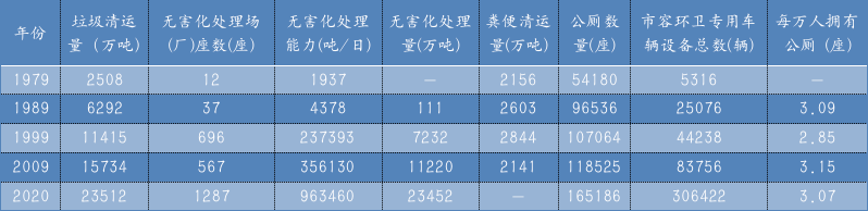 《年鑒》分別統(tǒng)計了城市、縣城和村鎮(zhèn)三部分市容環(huán)衛(wèi)大數(shù)據(jù),其中城市部分最為詳盡,包括了從1979-2020年的生活垃圾清運量、垃圾處理場(廠)數(shù)量、無害化處理能力、無害化處理量、糞便清運量、市容環(huán)衛(wèi)專用車輛設(shè)備總數(shù)、公廁數(shù)量及每萬人擁有公廁數(shù)(個別年份和統(tǒng)計項目空缺);縣城部分也包括上述統(tǒng)計項目,但日期是從2000年開始至2020年;村鎮(zhèn)部分則只有2020年數(shù)據(jù),統(tǒng)計項目只包含生活垃圾中轉(zhuǎn)站數(shù)量、環(huán)衛(wèi)專用車輛設(shè)備總數(shù)和公廁數(shù)量。《年鑒》顯示,2020年,全國城市生活垃圾清運量達23,512萬噸(約2.351億噸),總計擁有1287座無害化處理場(廠),生活垃圾處理能力963,460.15噸/日(約96.35萬噸/日),年無害化處理生活垃圾23,452萬噸(約2.345億噸)。全國城市擁有165,186座(約16.52萬座)公廁,平均每萬人擁有3.07座公廁,全國城市共擁有環(huán)衛(wèi)專用車輛設(shè)備306,422輛(約30.64萬輛)。表1 1979-2020年全國城市市容環(huán)衛(wèi)總體情況(大致按年代跨度)