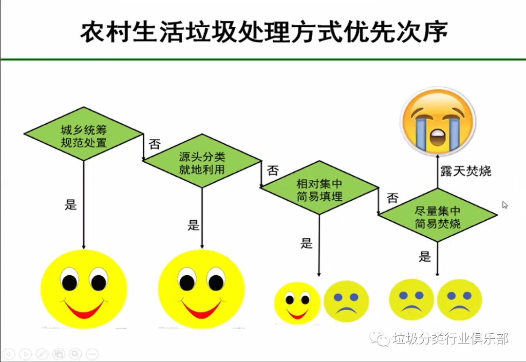如何讓農(nóng)村垃圾分類(lèi)在短時(shí)間得到改善?劉教授按優(yōu)先次序介紹了農(nóng)村生活垃圾處理方式:優(yōu)先考慮城鄉(xiāng)統(tǒng)籌、規(guī)范處置;如果有的地方達(dá)不到條件可以選擇源頭分類(lèi)、就地利用,形成一個(gè)利用體系。若實(shí)在不行就選擇相對(duì)集中簡(jiǎn)易填埋,但簡(jiǎn)易焚燒特別是露天焚燒是不提倡的,它對(duì)環(huán)境的危害性太大。