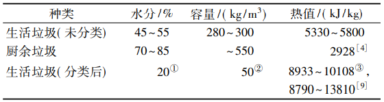 由表1可知:由于含有大量水分且容量較大的廚余垃圾被分離,分類后垃圾的水分含量約為20%,美國(guó)(19.02%)、歐洲(34.00%)、韓國(guó)(30.29%)相接近。水分降幅達(dá)到25百分點(diǎn)以上,使得可燃物質(zhì)的占比提升,單位垃圾熱值提升,同時(shí)在焚燒過程中由水分蒸發(fā)吸熱帶走的熱量也相應(yīng)減少,有利于垃圾焚燒放出熱量的充分利用。此外,分類后的生活垃圾以紙類﹑橡膠類、木竹類為主,容量明顯下降,依據(jù)加權(quán)計(jì)算結(jié)果僅為50 kg/m3,相對(duì)于同一焚燒爐來(lái)說(shuō),在保持進(jìn)料速率不變的情況下,分類后生活垃圾單位時(shí)間內(nèi)的進(jìn)料量相比未分類生活垃圾減少83%。