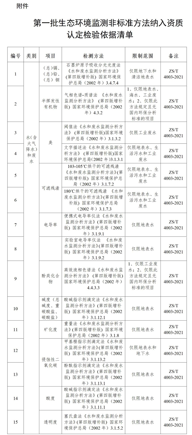 附件:第一批生態(tài)環(huán)境監(jiān)測非標準方法納入資質(zhì)認定檢驗依據(jù)清單.docx
