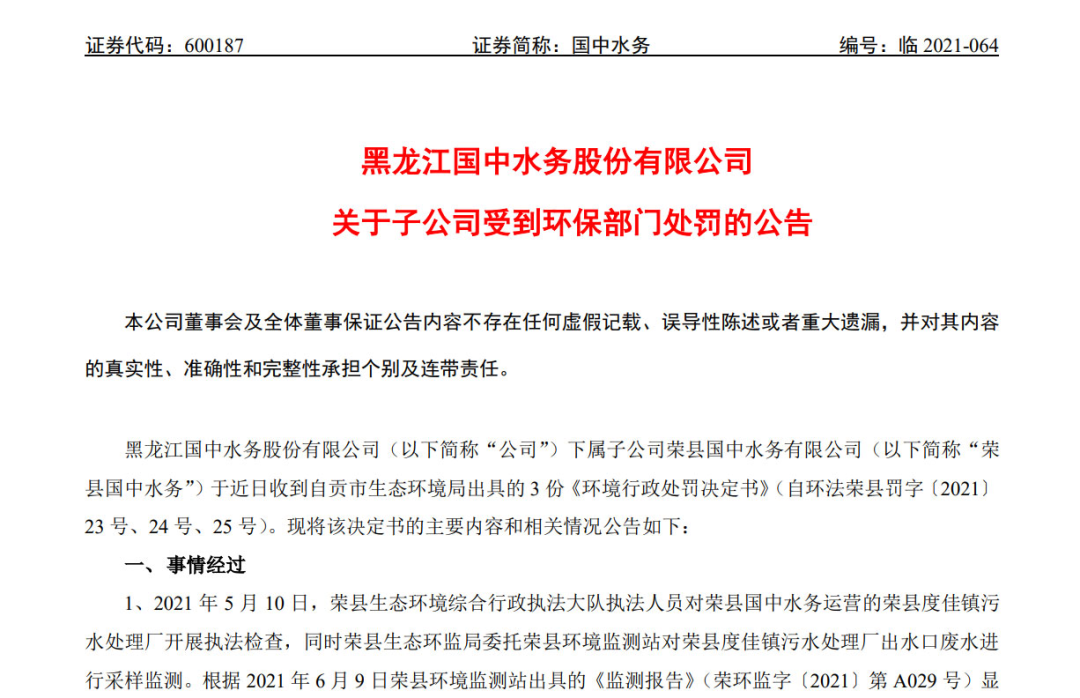 11月25日,國(guó)中水務(wù)(600187.SH)發(fā)布公告稱,其下屬子公司榮縣國(guó)中水務(wù)有限公司(下稱“榮縣國(guó)中水務(wù)”)因?yàn)椤斑M(jìn)水超標(biāo)導(dǎo)致的出水超標(biāo)及執(zhí)行標(biāo)準(zhǔn)認(rèn)定問題”,被罰共計(jì)85.70萬(wàn)元。