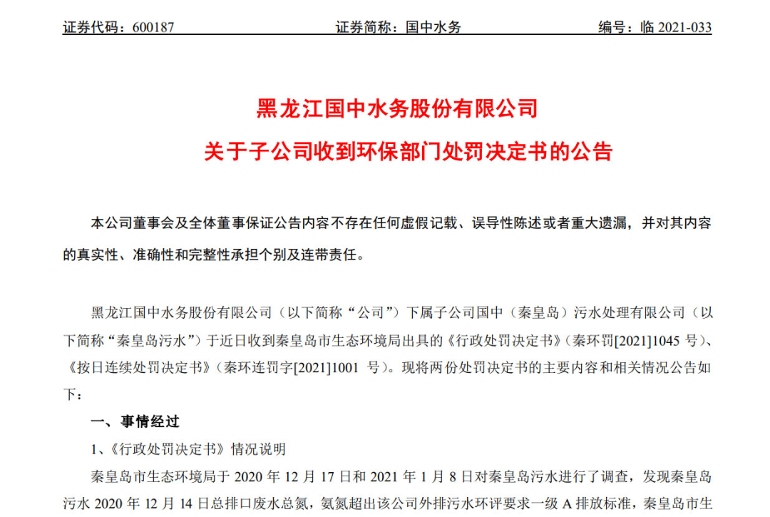 1、黑龍江國(guó)中水務(wù)股份有限公司關(guān)于子公司受到環(huán)保部門處罰的公告,國(guó)中水務(wù),2021-11-242、黑龍江國(guó)中水務(wù)股份有限公司關(guān)于子公司收到環(huán)保部門處罰決定書的公告。國(guó)中水務(wù),2021-08-123、黑龍江國(guó)中水務(wù)股份有限公司關(guān)于子公司收到環(huán)保部門處罰決定書的公告,國(guó)中水務(wù),2021-06-254、黑龍江國(guó)中水務(wù)股份有限公司關(guān)于子公司收到環(huán)保部門行政處罰告知書的公告,國(guó)中水務(wù),2021-04-285、黑龍江國(guó)中水務(wù)股份有限公司關(guān)于子公司受到環(huán)保部門處罰的公告,國(guó)中水務(wù),2021-01-066、因進(jìn)水導(dǎo)致出水超標(biāo),國(guó)中水務(wù)全年被罰款超千萬(wàn)!環(huán)保工程師,2021-11-267、【圖解年報(bào)】國(guó)中水務(wù):2020年歸母凈利潤(rùn)同比大增54.7%,約為3054萬(wàn)元,東方財(cái)富Choice數(shù)據(jù),2021-04-238、【圖解季報(bào)】國(guó)中水務(wù):2021年前三季度歸母凈利潤(rùn)為740萬(wàn)元,同比下降79.6%,東方財(cái)富Choice數(shù)據(jù),2021-10-299、進(jìn)水異常后擅自停運(yùn)被刑事調(diào)查,進(jìn)水超標(biāo)到底該咋辦?環(huán)保圈,2021-11-01