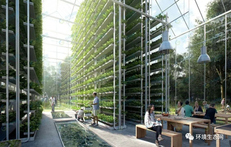 國外已經(jīng)開展了大量研究,綠色建筑的高級(jí)階段可以發(fā)展為 " 魚菜共生 " 系統(tǒng),使日常食物能夠在建筑內(nèi)實(shí)現(xiàn)并就近供應(yīng)。魚菜共生是一種新型的復(fù)合生態(tài)體系,它把水產(chǎn)養(yǎng)殖與水耕栽培兩種原本完全不同的農(nóng)耕技術(shù),通過巧妙的生態(tài)系統(tǒng)設(shè)計(jì),達(dá)到在建筑內(nèi)科學(xué)的協(xié)同共生,從而實(shí)現(xiàn)養(yǎng)魚不換水而無水質(zhì)憂患,種菜不施肥而正常成長的生態(tài)共生效應(yīng)。采取 24 小時(shí)燈光照射促進(jìn)蔬菜生長,而且水的利用率可以達(dá)到 90% 以上。在這個(gè)案例中,樓頂單位面積的蔬菜產(chǎn)量是大田里的 50 倍左右,非常高效,很值得中國以城市為主導(dǎo)的 " 碳中和 " 體系學(xué)習(xí)。