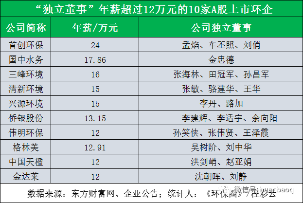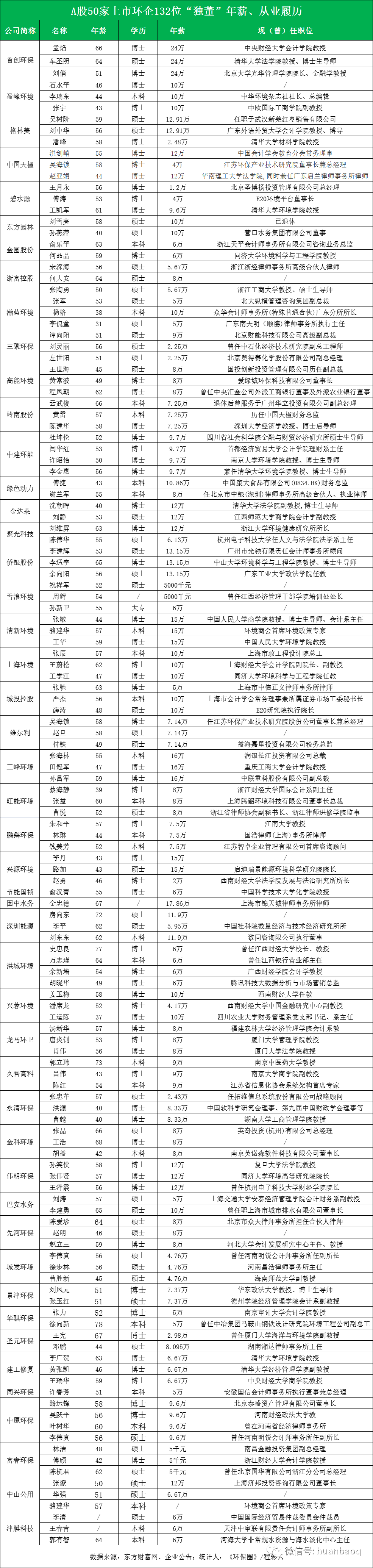 揭秘A股50家上市環(huán)企的132位獨董:簡單了解獨董職責之后,我們回歸環(huán)保行業(yè),談一談A股上市環(huán)企的獨立董事們。筆者查閱資料發(fā)現(xiàn),自從康美案落定后,A股上市環(huán)企中,還真有兩家上市環(huán)企獨董因個人原因提交了辭呈。一位是年薪僅5千元的富春環(huán)保獨立董事林潔,另一位是新三板公司博芳環(huán)保的獨立董事陳麗紅。兩個人都是因為“個人原因”提交的辭呈,巧合的是,辭職的時間都是在康美處罰案落地前后。排除這兩家之外,《環(huán)保圈》發(fā)現(xiàn),A股上市環(huán)企絕大多數(shù)獨立董事都比較淡定,沒有在敏感時期提出辭職。為了讓讀者進一步了解上市環(huán)企獨董的背景,《環(huán)保圈》對A股50家上市環(huán)企中132位獨立董事進行了逐一統(tǒng)計,從而進一步觀察他們年薪、學歷、背景、從業(yè)經(jīng)歷。首先,每家上市環(huán)企外聘的獨立董事數(shù)量幾乎是一樣的,都是3-4個。這跟證監(jiān)會要求有關(guān),“上市公司獨立董事人數(shù)不得少于董事會成員的1/3”。由于環(huán)保上市企業(yè)本身規(guī)模不大,董事會成員大多在10人左右,所以匹配3-4個獨立董事最為合適。其次,從薪資上看,每家企業(yè)外聘獨立董事的工資也是不一樣的。最高的當屬首創(chuàng)環(huán)保,分別給予孟焰、車丕照、劉俏教授年薪24萬/年;其次是國中水務(wù),其獨立董事金忠德薪酬17.86萬元/年;再者還有三峰環(huán)境、清新環(huán)境、興源環(huán)境、偉明環(huán)保、僑銀股份、格林美,中國天楹、金達萊等,這幾家企業(yè)對獨董也非常大方,年薪都在12萬/年以上,平均每月收入1萬元左右。