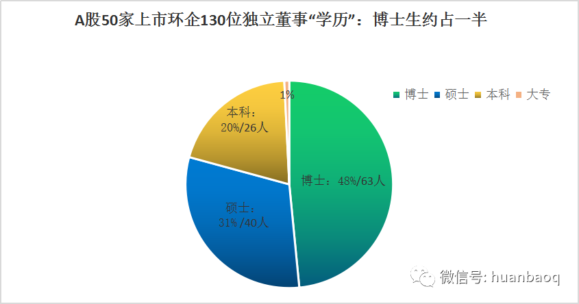雖然獨董這個職位工資看起來不太高,風險又很大,但它也不是人人都可以當?shù)模辽儆?個門檻:首先是學歷門檻,最低是本科,80%以上是碩士、博士。雖然《證券公司董事、監(jiān)事和高級管理人員任職資格監(jiān)管辦法》適當將證券公司獨立董事放寬至大專,但是在實踐中,別說大專學歷,就連本科學歷在獨立董事一職中也沒啥競爭力。筆者統(tǒng)計了A股50家上市環(huán)企130位獨董發(fā)現(xiàn),有且只有一位是大專學歷(雪浪環(huán)境獨董孫新衛(wèi)),但他同時還擁有注冊會計師、注冊評估師、會計師、資產(chǎn)評估師等證書,一定程度上彌補了學歷上的不足。剩余的129個獨立董事,80%以上是碩士、博士,其中博士占據(jù)了半壁江山,甚至有些還是博士生導(dǎo)師。▼A股50家上市環(huán)企132位獨立董事學歷統(tǒng)計
