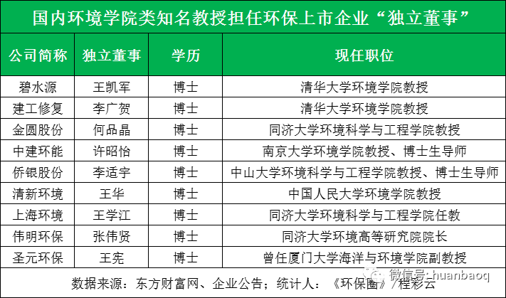 筆者還發(fā)現(xiàn)一個現(xiàn)象,有些環(huán)境院校的知名教授也兼職了獨立董事一職,不少還是業(yè)內(nèi)熟悉的面孔。比如業(yè)內(nèi)大咖王凱軍老師,既是碧水源的獨立董事,也是北控水務(wù)的獨立董事;再如同濟大學的何品晶老師,也是身兼數(shù)職,同時擔任金圓股份獨立董事、寶武集團環(huán)境資源科技董事、天津建昌環(huán)保董事等,還有中山大學教授李適宇也擔任著僑銀股份的獨立董事。▼擔任上市環(huán)企獨立董事一職的環(huán)境學院類教授