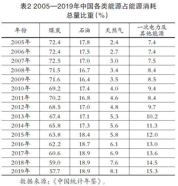 近年來,中國一次能源消費結(jié)構(gòu)呈現(xiàn)出明顯的低碳化、清潔化趨勢(見表2)。2005—2019年煤炭消費量比重從72.4%下降至57.7%,共下降14.7個百分點;天然氣消費量則從2.4%提高到8.1%,清潔能源(一次電力及其他能源)消費量從7.4%提高到15.3%,合計占比提高13.6個百分點。