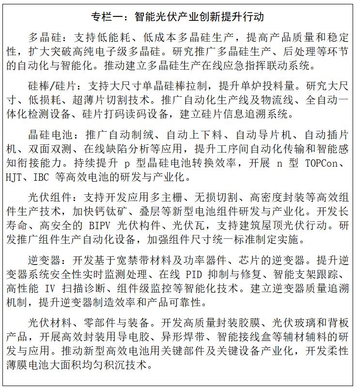 加快產(chǎn)業(yè)技術創(chuàng)新。推進智能光伏產(chǎn)業(yè)鏈技術創(chuàng)新,加快大尺寸硅片、高效太陽能電池及組件等研制和突破。夯實配套產(chǎn)業(yè)基礎,推動智能光伏關鍵原輔料、設備、零部件等技術升級。開展智能光伏與建筑節(jié)能、交通運輸、綠色農(nóng)業(yè)等領域相結合的交叉技術研究。