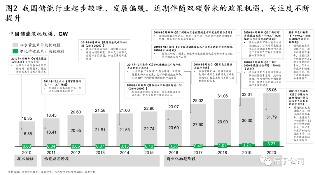 我國在儲能產(chǎn)業(yè)的戰(zhàn)略布局開始于2005年出臺的《可再生能源發(fā)展指導目錄》。經(jīng)過十多年的發(fā)展,目前儲能方面的政策已日趨完善,儲能發(fā)展已從研發(fā)示范向規(guī)?;⑹袌龌瘧?yīng)用轉(zhuǎn)變。