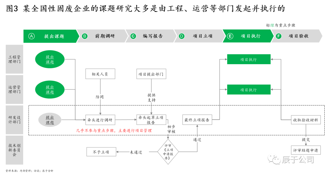 我們也注意到,很多生態(tài)環(huán)保企業(yè)研發(fā)活動的起點并非由戰(zhàn)略驅(qū)動,更多來自工程、運營等業(yè)務(wù)上的具體問題,技術(shù)研發(fā)則處于配合和支持其他部門的位置,引領(lǐng)性不足(見圖3)。由于缺乏對公司未來發(fā)展的前瞻性思考,他們也并未對各細(xì)分市場的發(fā)展趨勢、競爭對手、客戶需求、政策法規(guī)等進(jìn)行深入分析,明確的產(chǎn)品規(guī)劃包括產(chǎn)品類型定義、定位以及如何與競爭對手實現(xiàn)差異化戰(zhàn)略等也就無從說起。