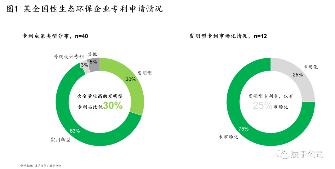 以我們服務(wù)過的某全國性生態(tài)環(huán)保企業(yè)為例,盡管營業(yè)收入已近70億元,但當(dāng)年的研發(fā)投入不足1000萬元,專利申請數(shù)區(qū)區(qū)40件,且63%的為實用新型專利,含金量較高的發(fā)明型專利僅占30%,其中又只有25%的進(jìn)行了商業(yè)應(yīng)用(見圖1)。