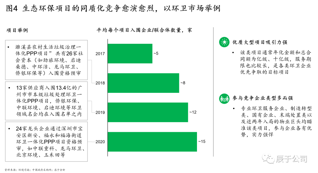 這樣帶來的直接后果就是同質(zhì)化競爭愈演愈烈,價格戰(zhàn)時有發(fā)生,不僅影響企業(yè)的盈利水平,也對后期的運營帶來隱患。由于缺乏有門檻的技術(shù)壁壘,一些環(huán)保項目的招標(biāo)活動動輒十幾家甚至數(shù)十家企業(yè)參加(見圖4),而針對一些技術(shù)難度大的項目,要么無人問津不敢接手,要么接手了之后最終陷于無計可施的尷尬境地。