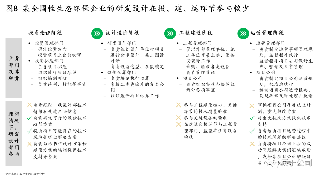 國內(nèi)生態(tài)環(huán)保企業(yè)“重投建、輕技運”的問題由來已久,由于沒有將研發(fā)設(shè)計放在一個正確的位置與高度,導(dǎo)致總部-事業(yè)部-項目公司的研發(fā)設(shè)計定位不清,該總部牽頭做的沒人做,該項目公司負(fù)責(zé)的,由于目的明確、相對簡單,各級主體“搶著做”,原本有限的技術(shù)資源散亂在內(nèi)部的各個層級和角落,沒有形成各司其職、各盡其責(zé)、上下一致的合力。