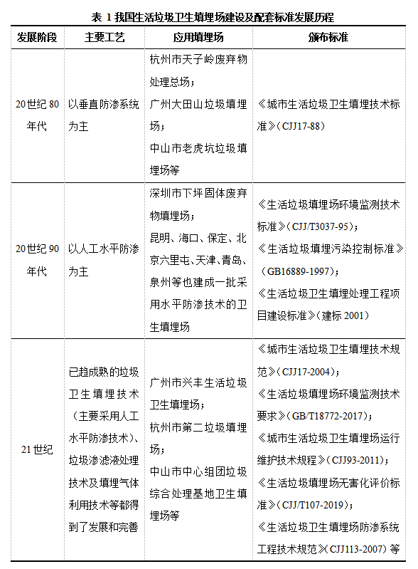 1.1 我國垃圾填埋場(chǎng)發(fā)展歷程 我國生活垃圾衛(wèi)生填埋技術(shù)主要經(jīng)歷了三個(gè)階段:20世紀(jì)80年代以垂直防滲為主的衛(wèi)生填埋場(chǎng)、20世紀(jì)90年代以水平防滲為主的衛(wèi)生填埋場(chǎng)、21世紀(jì)垃圾衛(wèi)生填埋技術(shù)、垃圾滲濾液處理技術(shù)及填埋氣體利用技術(shù)完善的衛(wèi)生填埋場(chǎng),建設(shè)及配套標(biāo)準(zhǔn)見表1[1]。