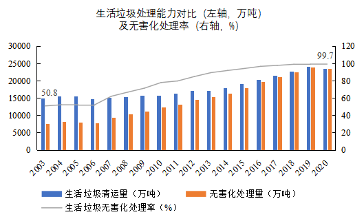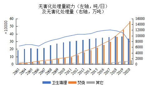 圖 1我國2003-2020年生活垃圾清運(yùn)量及無害化處理能力(數(shù)據(jù)來源:中國統(tǒng)計(jì)年鑒)