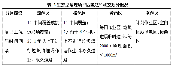 垃圾填埋場(chǎng)的生命周期主要分為三個(gè)階段:建設(shè)階段、運(yùn)行階段和封場(chǎng)修復(fù)階段。垃圾填埋場(chǎng)應(yīng)根據(jù)《生活垃圾衛(wèi)生填埋場(chǎng)處理工程項(xiàng)目建設(shè)標(biāo)準(zhǔn)》(建標(biāo)124-2009)建設(shè),建設(shè)項(xiàng)目主要包括填埋場(chǎng)主體工程與設(shè)備、配套工程和生產(chǎn)管理與輔助設(shè)施及生活服務(wù)設(shè)施等,建設(shè)完成后進(jìn)入運(yùn)行階段。衛(wèi)生填埋場(chǎng)運(yùn)行管理應(yīng)符合《生活垃圾填埋場(chǎng)運(yùn)行管理規(guī)范》(DB11/T 270-2014)。在運(yùn)行階段,生態(tài)型填埋場(chǎng)采用 “四色法”(國作登字-2020-L-01092309)對(duì)填埋場(chǎng)進(jìn)行動(dòng)態(tài)劃分,即綠色區(qū)、黃色區(qū)、灰色區(qū)和橙色區(qū),詳見表2。