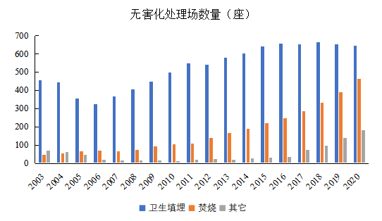 圖2 我國2003-2020年不同類型的無害化處理場(chǎng)數(shù)量(數(shù)據(jù)來源:中國統(tǒng)計(jì)年鑒)