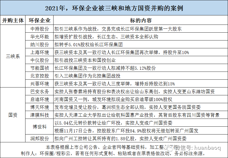 深:影響之深為近年來之最,去年發(fā)生的88起收并購,從某種意義上講已經(jīng)不是某些企業(yè)的戰(zhàn)略進與退,也不是傳統(tǒng)行業(yè)跨界環(huán)保這樣簡單,它背后傳遞的信號有央企、國資、民企、外企四股力量的競爭更迭,也有行業(yè)最徹底洗牌、低負債對高負債的清算等,意味深遠。并購頻率之多、交易金額之大,波及范圍之廣,產(chǎn)業(yè)影響之深,讓2021年環(huán)保產(chǎn)業(yè)收并購更加有看頭。在這一年里,我們不僅見證了世界級環(huán)保巨頭“老大并購老二”的一波三折,也領(lǐng)略了三峽、地方國資進擊環(huán)保行業(yè)的“兇猛”,還看到了部分民企賣資產(chǎn),國資接盤“混改”大潮的落幕。從2020年8月,威立雅首次提出要收購蘇伊士股份起,直到2021年12月14日,歐盟委員會正式批準二者收購交易,這場歷時1年零三個月,震驚環(huán)保圈的收購大案也進入收尾階段。最終的收購價,威立雅同意以每股20.50歐元的價格收購蘇伊士股份,要比最初的每股15歐元的報價加價不少。(詳情查閱:威立雅蘇伊士簽署合并協(xié)議,“洋水務(wù)”劍指中國市場?)去年6月,中國天楹宣布要15億歐元(折合人民幣約115億元)出售Urbaser 100%股權(quán),9月底就走完了各項流程,10月中下旬就披露完成了所有交割事項,速度非???,絲毫不拖泥帶水。對于這場收購案,媒體評價大都是正面,甚至有的還說中國天楹“里外躺贏”,在持有Urbaser的這些年中,中國天楹不僅在技術(shù)提升、產(chǎn)業(yè)鏈布局、海外業(yè)務(wù)、品牌影響力等方面獲益匪淺,而且通過買賣騰挪,中間除了掙了3.5億歐元投資差價之外,還把公司資產(chǎn)負債率,商譽減值風險都降低了,簡直是人生贏家。(詳情查閱:中國天楹擬15億歐元出售Urbaser,賠了or賺了?)“一波三折”的城發(fā)環(huán)境換股吸收合并啟迪環(huán)境案,從去年年初一直持續(xù)到8月,才經(jīng)過河南省財政廳及河南省國資委正式批復(fù),中間較為突破的是6月份,城發(fā)環(huán)境宣布擬12.8億元并購啟迪環(huán)境相關(guān)資產(chǎn),其中擬定10億元收購鄭州啟迪零碳100%股權(quán),2.81億元收購武漢啟迪生態(tài)所持的5家下屬公司95%股權(quán)。帶著政治任務(wù)而來的三峽集團,近兩年不斷擴大自己“朋友圈”,一旦被其看上,輕則舉牌增持股份,比如興蓉環(huán)境、上海環(huán)境就多次獲其增持;重則引入戰(zhàn)投,躍居大股東,比如中持,享受項目、訂單上的傾斜。據(jù)筆者不完全統(tǒng)計,2021年,三峽系通過三峽資本以及一致行動人長江生態(tài)環(huán)保集團,引戰(zhàn)投、舉牌增持上市環(huán)企高達8家,其中不僅有北控水務(wù)、上海環(huán)境、中持股份、興蓉環(huán)境等水務(wù)龍頭,還有華光環(huán)能、納川股份、中儀股份等細分領(lǐng)域的“強兵悍將”。最后的這個,不是某一家環(huán)保企業(yè),而是一類環(huán)保企業(yè)。從2018年起,環(huán)保行業(yè)的“混改潮”已經(jīng)持續(xù)了好幾年。本以為這場上市民企易主、國資混改的悲情大戲就要完結(jié)了,誰知去年還是斷斷續(xù)續(xù)有地方國資接盤上市民企案發(fā)生,兜兜轉(zhuǎn)轉(zhuǎn),博世科、巴安水務(wù)、博天環(huán)境、潤邦股份、啟迪環(huán)境終于在去年成功聯(lián)姻國資,抱上了金主大腿。▼圖五:三峽系和地方國資增持并購環(huán)保案例