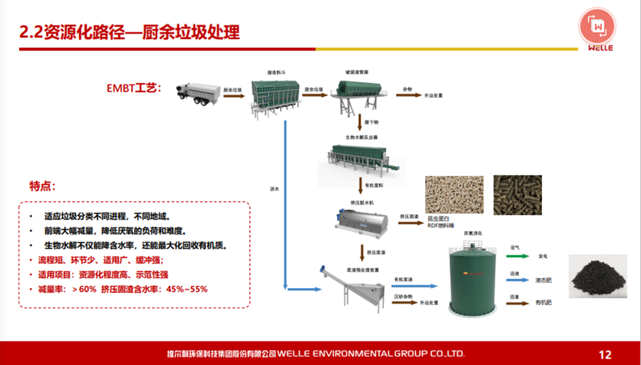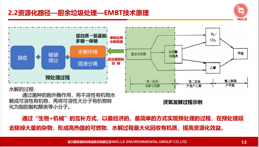 對(duì)于濕垃圾或者是廚余垃圾,我們特別推出一款技術(shù)——EMBT技術(shù)。結(jié)合生物水解技術(shù),原理是有機(jī)廢棄物或者有機(jī)物在厭氧發(fā)酵過(guò)程當(dāng)中主要是通過(guò)酸化水解以及產(chǎn)甲烷兩個(gè)階段,我們通過(guò)設(shè)施化的反應(yīng)器,把酸化水解在前面就能夠作為預(yù)處理,真正地溶解到水下面的有機(jī)物再到厭氧處理,這樣使得厭氧反應(yīng)器不要那么復(fù)雜,剩下的固渣資源化也會(huì)比較方便,去做水量化的利用都是可行的。這個(gè)工藝現(xiàn)在在上海包括在紹興做下來(lái),還是受到比較多的認(rèn)可。