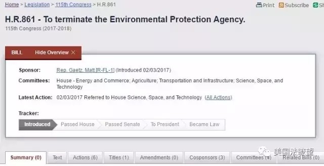 2017-02-14 中國(guó)環(huán)境新聞2017年2月3日,美國(guó)國(guó)會(huì)公布了一份來(lái)自國(guó)會(huì)參議員的提案,名稱(chēng)為《撤銷(xiāo)環(huán)境保護(hù)局》(To terminate the Environmental Protection Agency),提議在2018年底撤銷(xiāo)國(guó)家環(huán)境保護(hù)局。What ? 在環(huán)境議題已經(jīng)在全世界廣受關(guān)注的時(shí)候,居然會(huì)有人提議撤銷(xiāo)環(huán)保局!美國(guó)國(guó)會(huì)網(wǎng)站公布的“關(guān)于撤銷(xiāo)環(huán)境保護(hù)局議案”這份“撤銷(xiāo)環(huán)境保護(hù)局”的議案由來(lái)自佛羅里達(dá)州第一選區(qū)的參議員馬特?蓋茨(Matt Gaetz)牽頭提出,該議案同時(shí)有另外三名共和黨議員聯(lián)名附屬簽名提出。