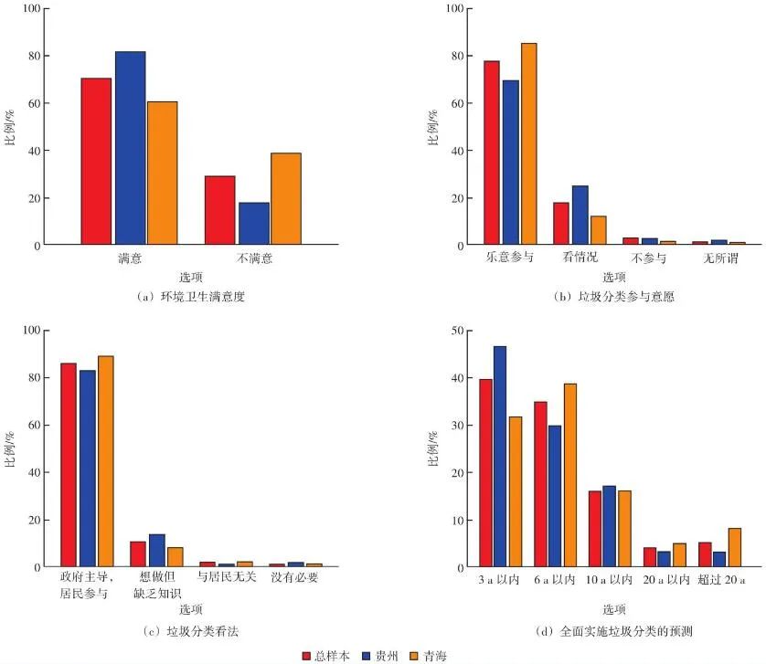 基于青海和貴州兩地的調(diào)查數(shù)據(jù)(共302份有效問卷),分析西部地區(qū)居民垃圾分類意愿及影響因素,發(fā)現(xiàn)環(huán)境衛(wèi)生滿意度為72%。78%的受訪者愿意參與分類,86%的受訪者支持“政府主導(dǎo),居民參與”,強制分類(72%)、濕垃圾破袋投放(68%)和定時定點投放(61%)3項措施的接受程度較高。分類不方便、設(shè)施不完善、宣傳力度不足、缺乏社會氛圍是阻礙居民垃圾分類的主要因素。建議構(gòu)建政府主導(dǎo)、多方參與的垃圾治理機制,提高垃圾桶配置率和覆蓋率,提高垃圾分類投放的便利性,采取針對性的宣傳策略,營造全民參與垃圾分類的社會氛圍。在采取多樣化的管理措施組合方式下,青海、貴州兩地分別側(cè)重加強強制型管理和引導(dǎo)型管理。