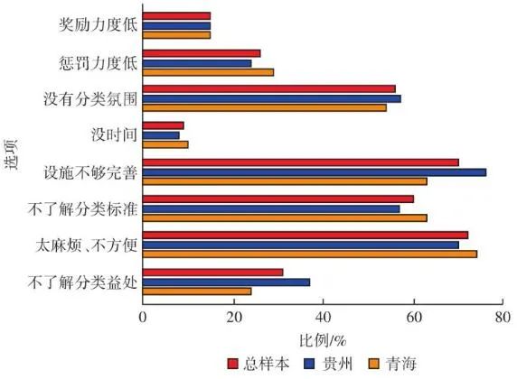 圖 4 實施垃圾分類的困難分析 完善配套設(shè)施是居民實施垃圾分類的硬件基礎(chǔ),但其所發(fā)揮的實際效果很大程度上取決于主觀因素,受政策宣傳的影響較大。調(diào)查對垃圾分類政策的了解情況,結(jié)果如圖4(b)所示,其選項包括“非常了解”“比較了解”“很少了解”和“完全不了解”,選擇率分別為6%、34%、55%、5%。60%的受訪者對相關(guān)政策的了解不充分,“非常了解”的受訪者不足一成,政策認(rèn)知水平較低。與青海樣本相比,政策認(rèn)知程度低的問題在貴州樣本中更突出[Sig.(雙側(cè))<0.05]。