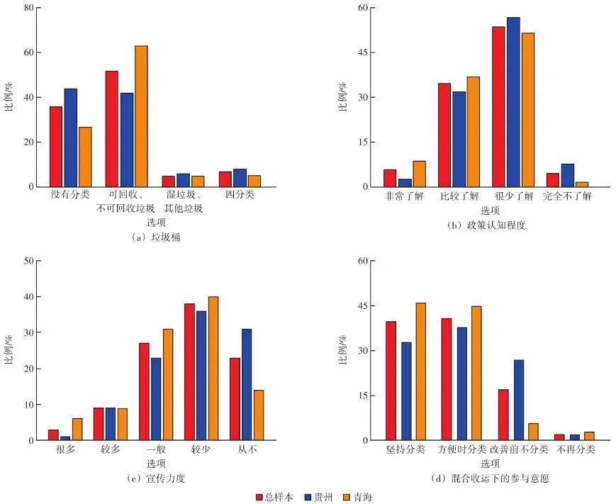 垃圾分類配套設(shè)施直接影響源頭分類的整體效果,70%的受訪者認(rèn)為居住地配套設(shè)施不完善(圖3)。西部地區(qū)普遍存在垃圾分類配套設(shè)施不完善的問題,如圖4(a)所示,多數(shù)的垃圾桶僅分為兩類(58%),達到四分類標(biāo)準(zhǔn)的比例僅為7%。沒有安置分類垃圾桶的比例高達35%。青海(8%)、貴州(5%)兩地選擇“四分類”的比例均不足一成,垃圾分類配套設(shè)施均有待完善。