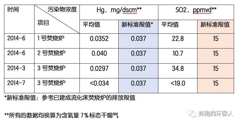 2014年的煙氣排放檢測數(shù)據(jù)顯示,煙氣中的污染物主要是汞和SO2無法滿足2016年生效的新標準排放限值,以下每個數(shù)據(jù)都是三次測試的平均值:
