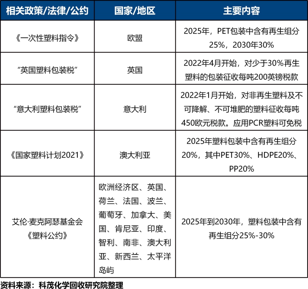 化學回收PCR塑料與原生塑料品質(zhì)相同,可用于食品和醫(yī)藥等高要求領域。在恰當時機,可考慮學習歐洲、澳洲的PCR塑料政策和艾倫·麥克阿瑟基金會發(fā)起的《塑料公約》。歐洲在PCR塑料終端產(chǎn)品鼓勵政策方面走在全球前列,例如:①歐盟《一次性塑料指令》要求到2025年PET包裝中含有PCR組分25%;②英國塑料包裝稅對少于30%再生塑料的包裝征收每噸200英鎊稅款;③全世界十余個國家和地區(qū)簽署《塑料公約》,承諾到2025—2030年,塑料包裝中含有PCR組分25%~30%等。可在特定行業(yè)率先開展化學回收PCR塑料應用試點,推動化學回收PCR塑料的終端使用。